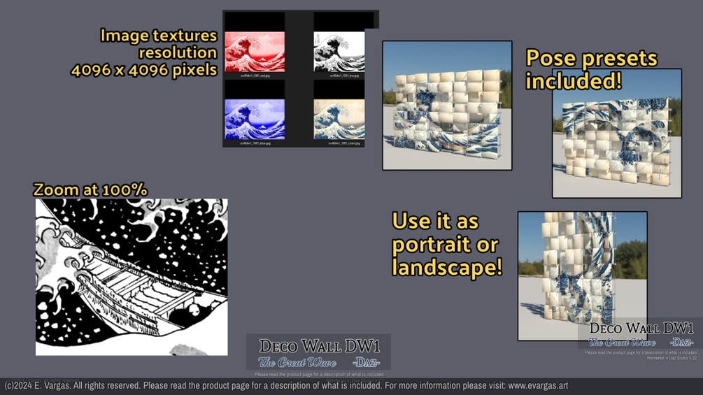 Decorative wall with mosaic panels, displaying the famous work of Katsushika Hokusai. Highly customizable: you can use your own image (as one piece) and see it sliced on the various panels! Landscape and portrait poses included. Prop measures approx. 5 x 3.5 x 0.6 meters. Mesh contains 46390 points.