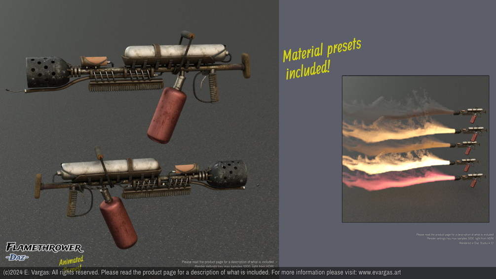 • Material presets (Iray) for the flame. The propgun has only a "default" preset to fallback in case you need it (PBR textures 4k for color/metalness/normal/roughness).