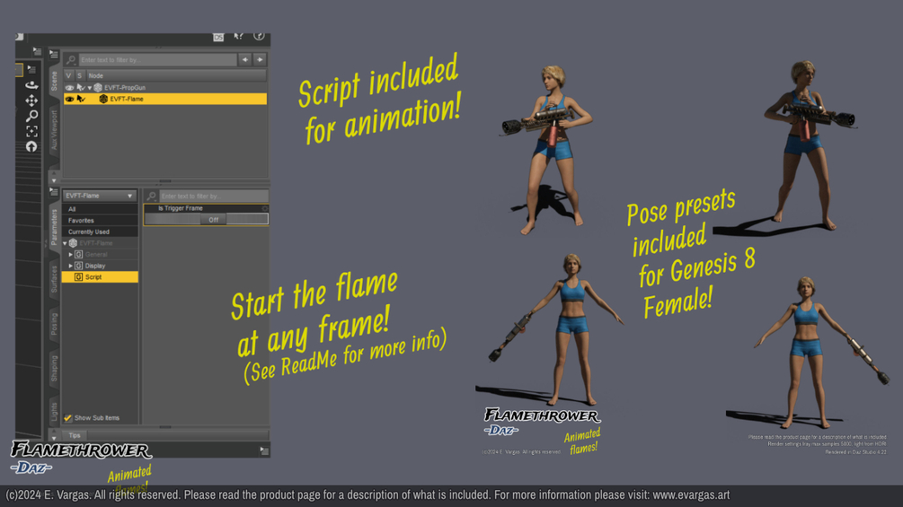Flamethrower propgun with animated flames and pose for Genesis 8 Female. Propgun measures approx. 0.13 x 0.14 x 0.93 meters, flame measures approx. 2 x 2 x 5 meters.
